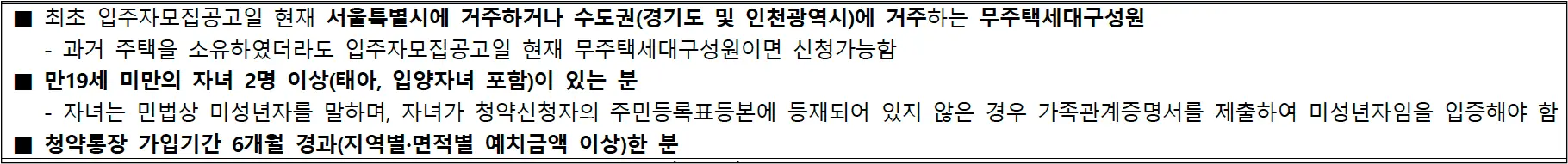 서울시 및 수도권 거주 무주택세대구성원으로 만 19세 이상 자녀 2명(입양자 및 태아포함), 청약통장 6개월 이상 경과하신 분에 한합니다.