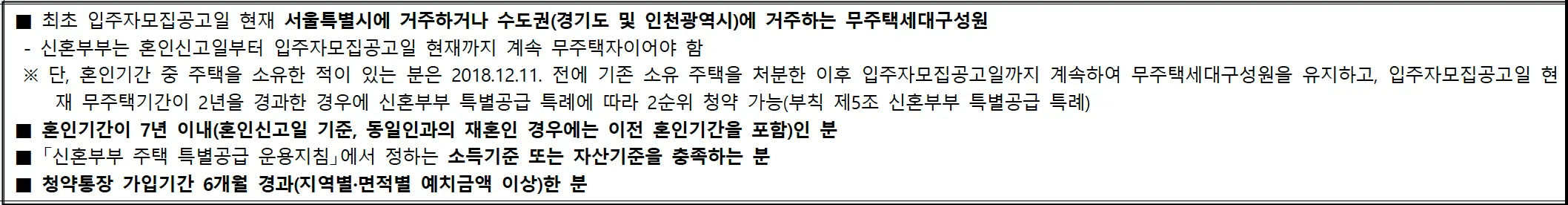 서울시 및 수도권 거주 무주택세대구성원으로 혼인기간 7년 이내, 소득 및 자산기준 충족, 청약통장 6개월 이상 경과하신 분에 한합니다.