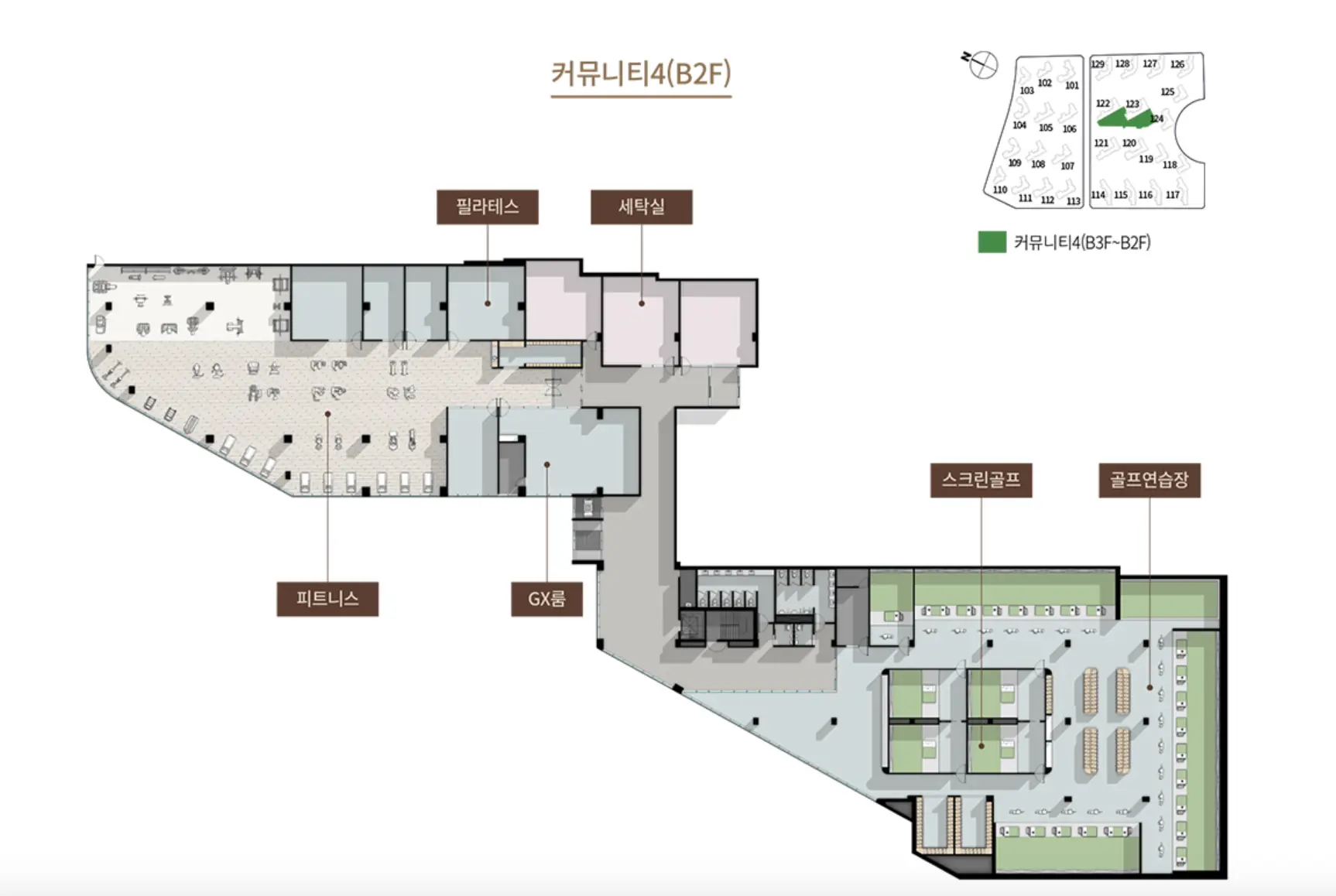 최고의 단지에 걸맞게 스크린골프 및 골프연습장, 필라테스, GX룸, 피트니스와 수영장, 실내체육관, 러닝트랙, 사우나등을 갖추고 있습니다.