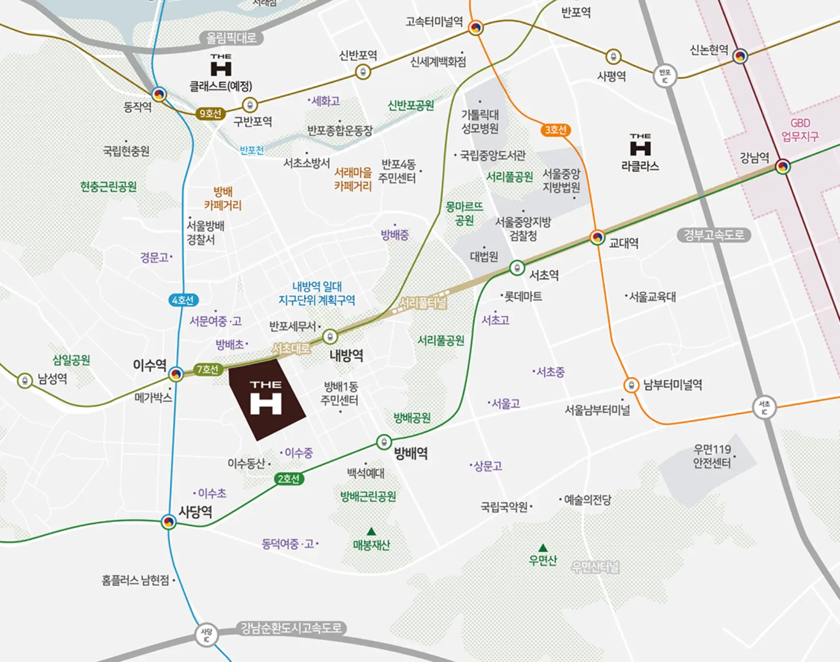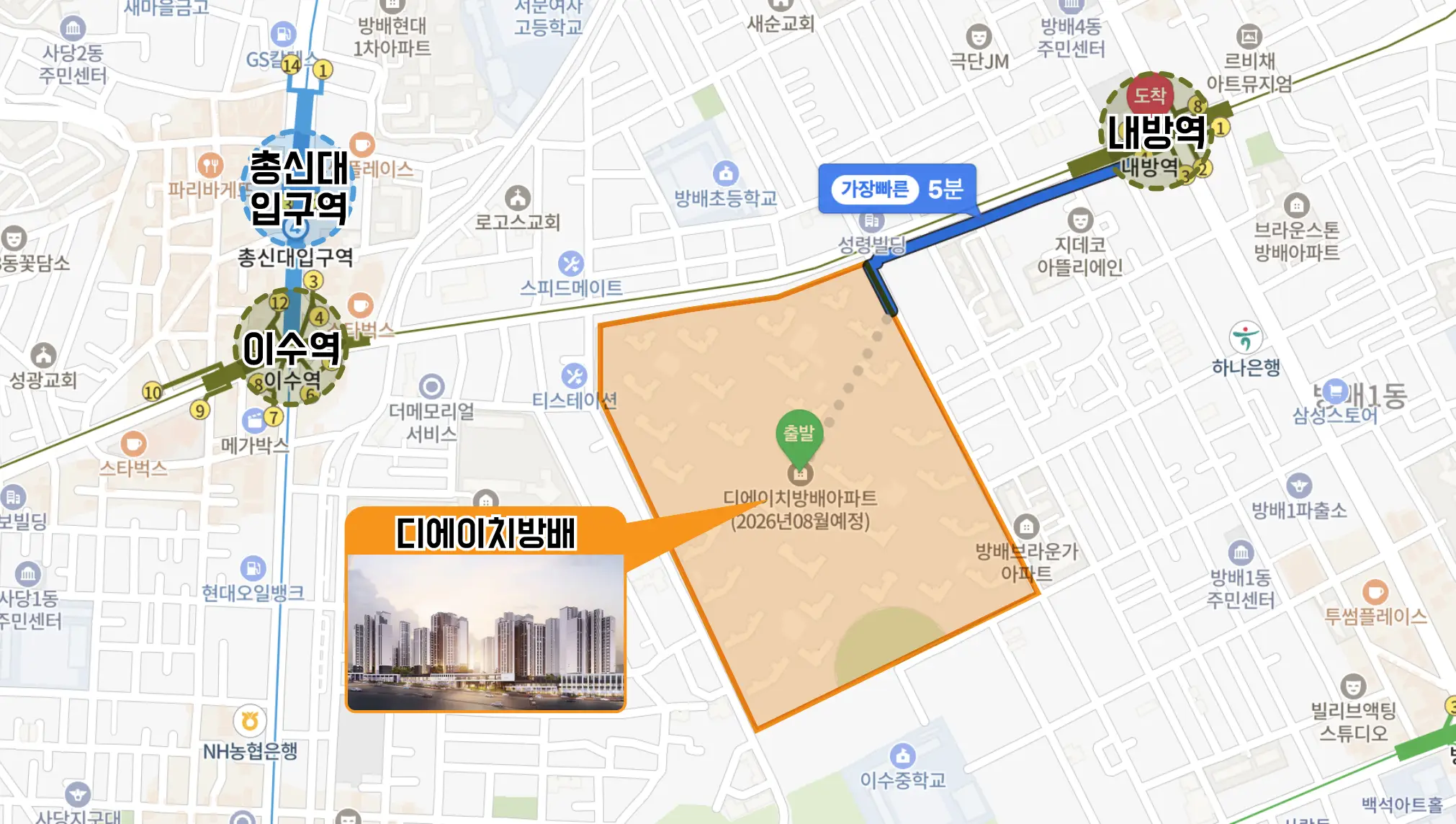 지하철 7호선 내방역과 이수역, 지하철 4 호선 총신대역이 도보 5분 위치에 있어 역세권으로서 최적의 자리에 위치하고 있습니다.