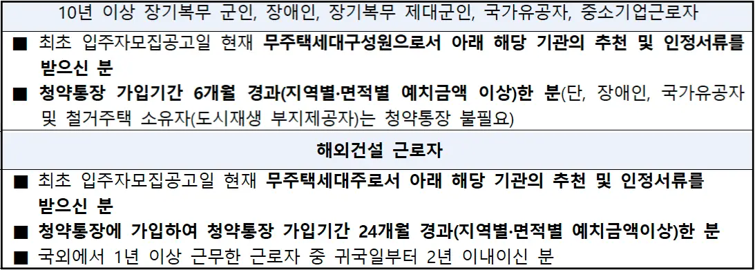 대상자는 장기복무 군인 및 해외건설근로자로 해당기관의 추천 및 인정서류를 득해야 합니다.