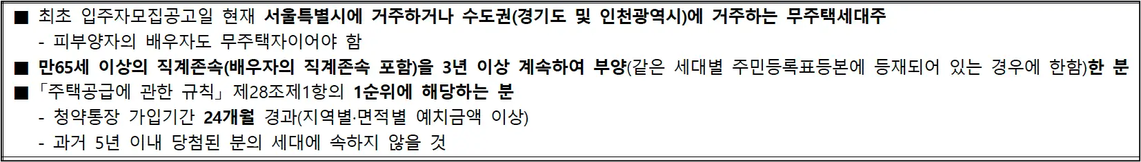 서울시 및 수도권 거주 무주택세대구성원으로 만 65세 이상 직계존속부양, 청약통장 24개월 이상 경과하신 분에 한합니다.