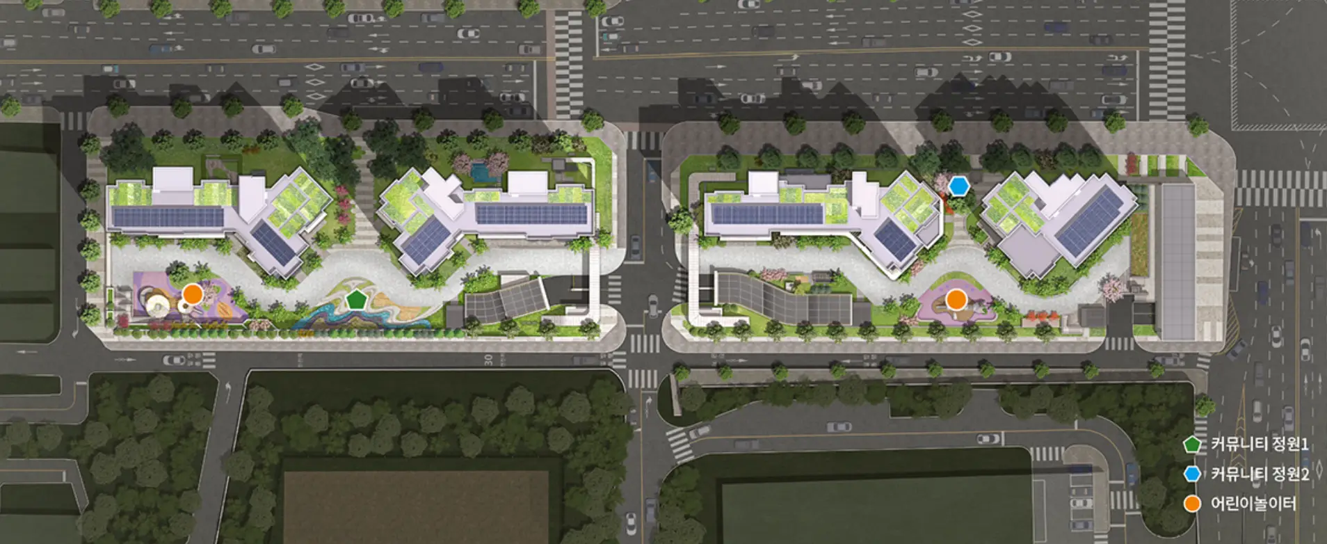 단지 외곽을 둘러싸고 있는 대형 문주와 부대시설 등의 통합형 디자인을 적용 랜드마크 단지 조성과 주차장을 지하와 하여 극대화 한 조경, 차량과 보행동선 등을 분리해 안전한 단지 조성에 힘썼습니다.