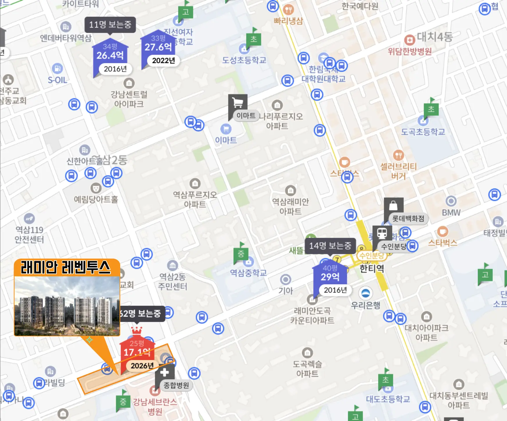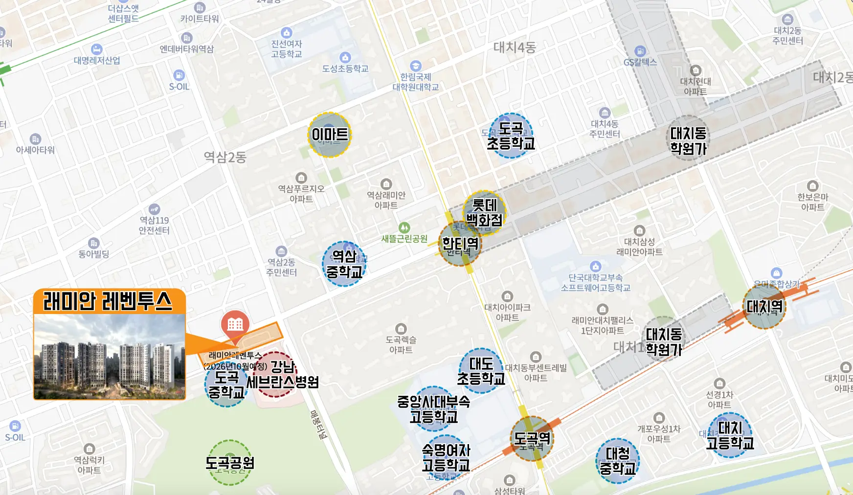 단지 주변 도곡중, 역삼중, 단대부중·고 등이 대표되는 강남 8 학군과 더불어 대치동 학원가 도보이용, 강남권에서도 손꼽히는 교육환경과 더불어 세브란스병원, 이마트, 롯데백화점등 생활인프라까지 갖춰져 있습니다.