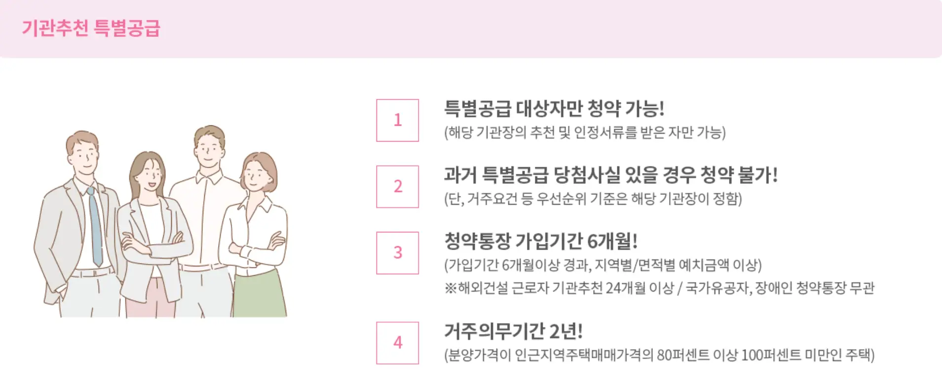 - 청약부금 : 청약부금 12개월 경과, 매월 약정납입일 납부 월납입인정금액이 예치금액 이상(전용면적 85㎥이하 한함)