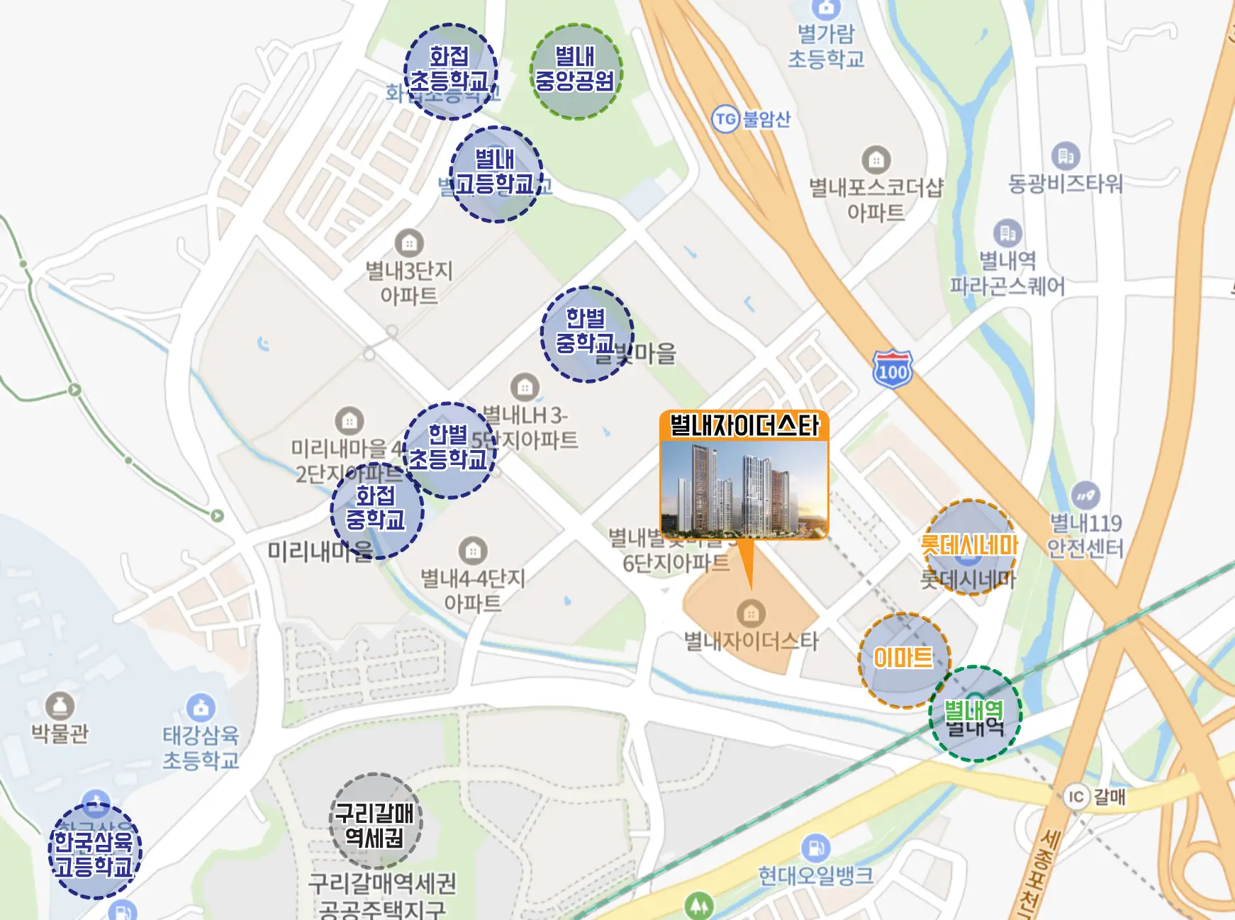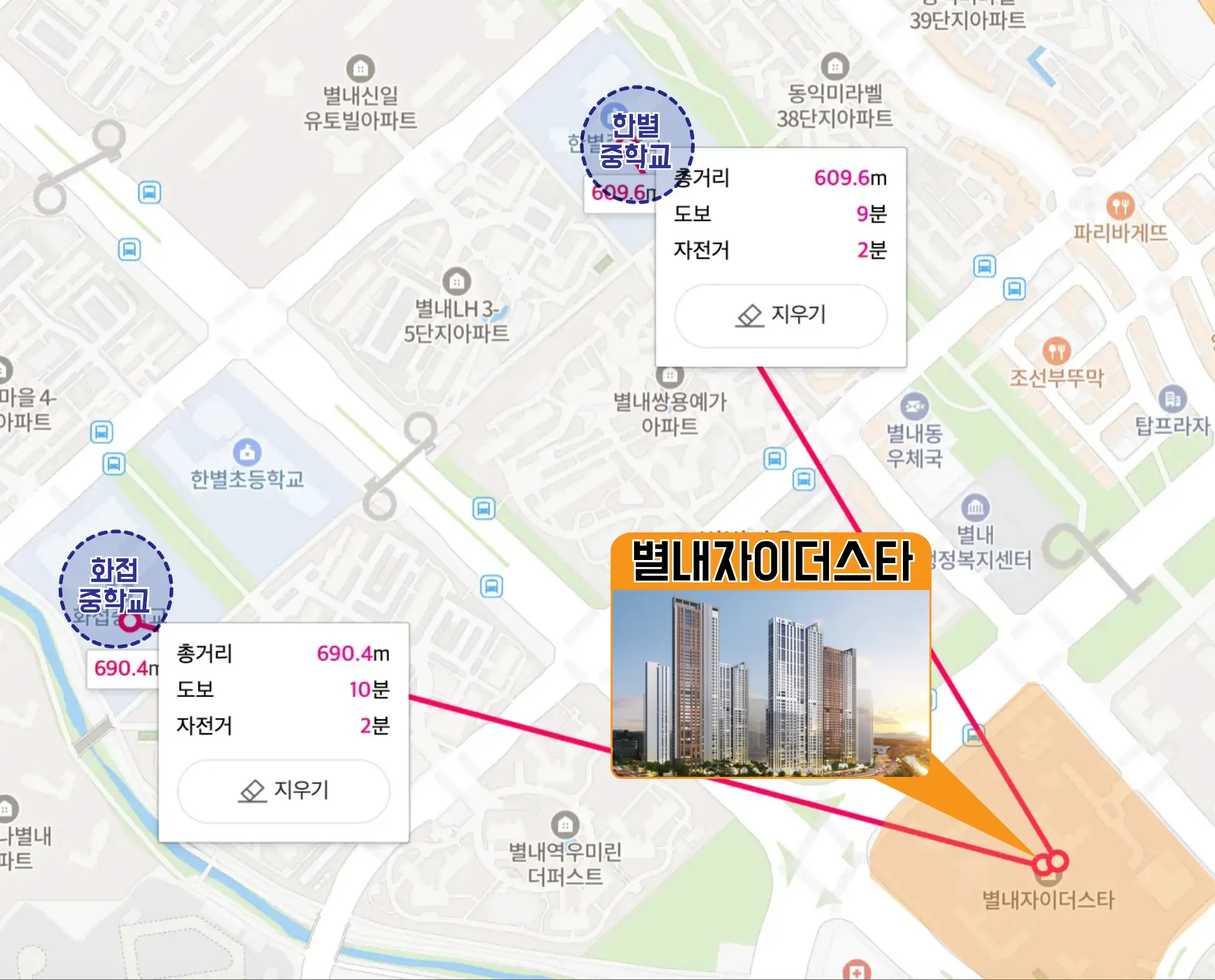 별내자이더스타에서 한별초까지는 도보 9분, 한별중과 화접중까지는 각각 도보 9분과 10분이 소요되는 근접 학세권입니다.