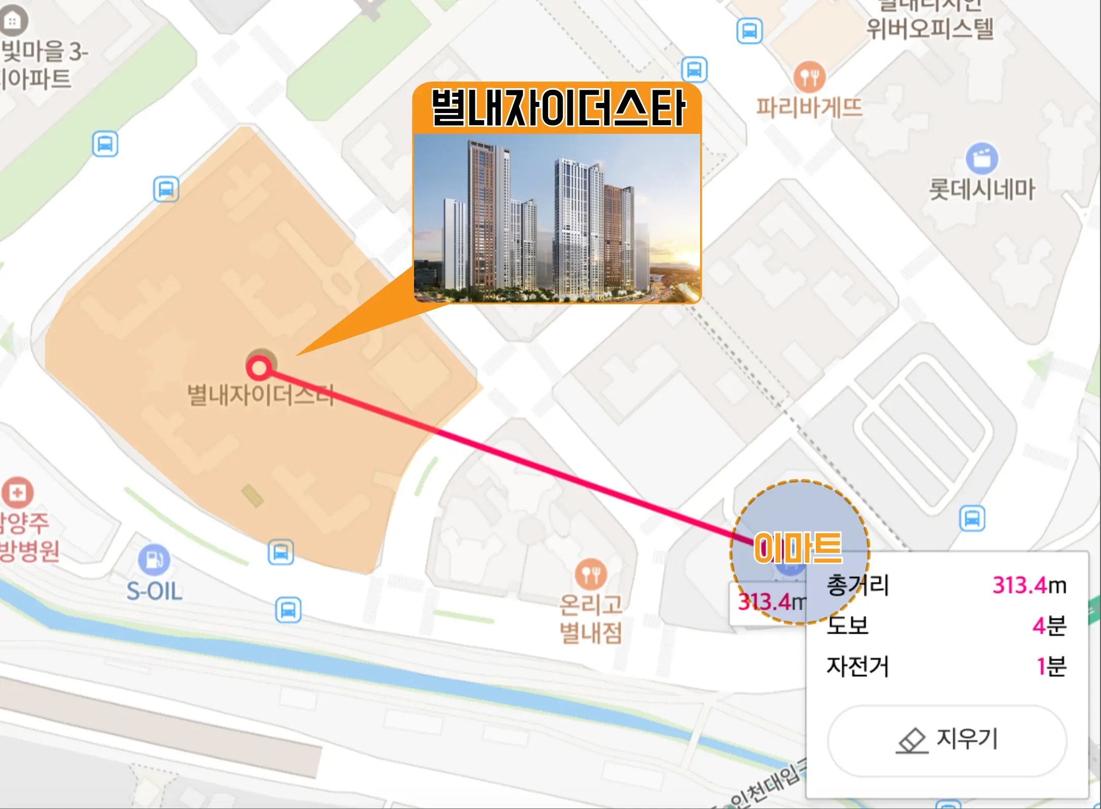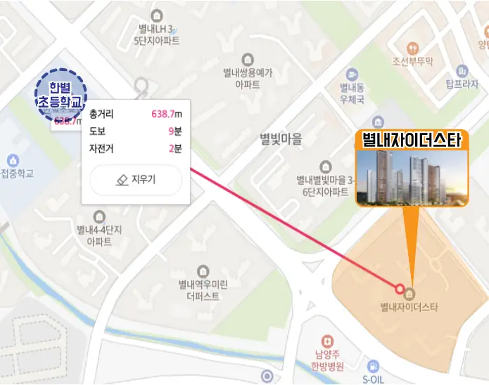 또한 별내자이더스타에서 이마트까지는 도보 4분, 별내역까지는 도보 6분이 소요됩니다.