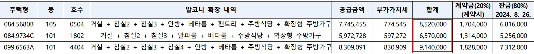 | 타입 | 분양가 | 발코니 확장 | 기타옵션 |
