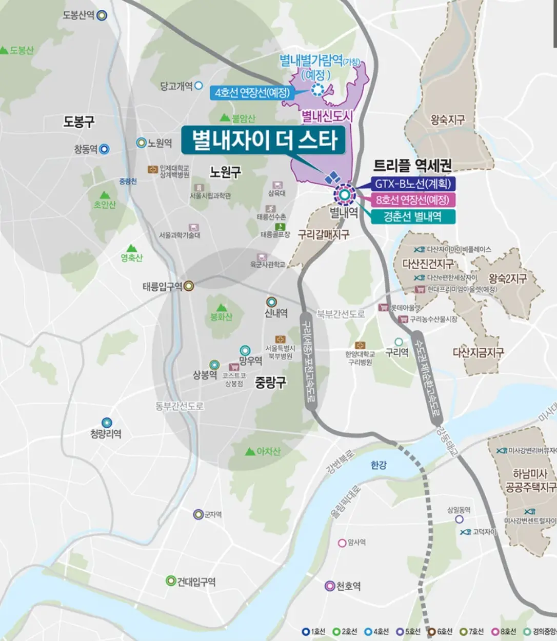 또한 GTX-B노선과 8호선 연장, 4호선 별내별가람 역 연장의 교통호재를 바탕으로 왕숙지구 다산진건지구, 왕숙 2 지구등의 대형 주거타운이 건설될 예정입니다.